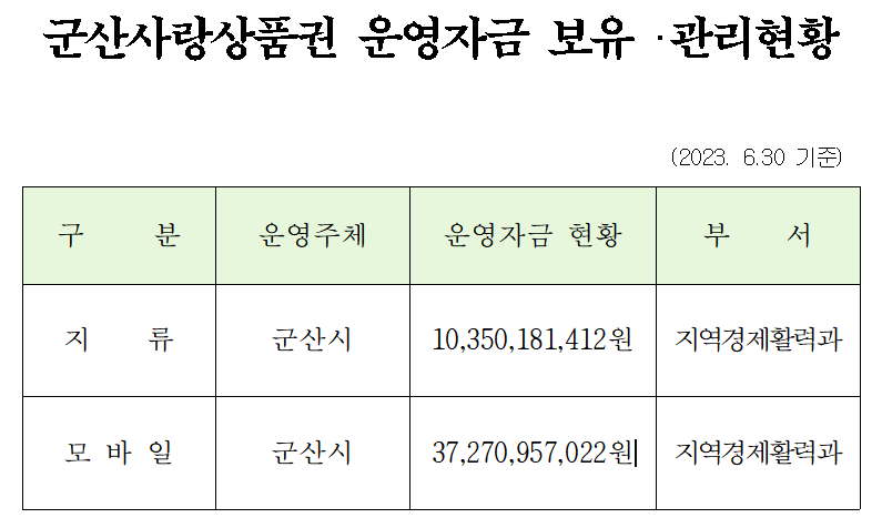 | 115 | 군산사랑상품권 운영자금 보유,관리 현황 (23. 6. 30. 기준) |