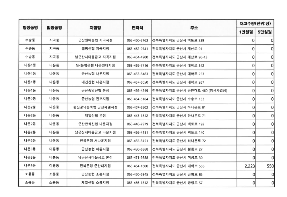 2024년 10월 4일 오전 11시 30분 기준 군산사랑상품권(지류) 지점별 재고현황을 다음과 같이 게시합니다.