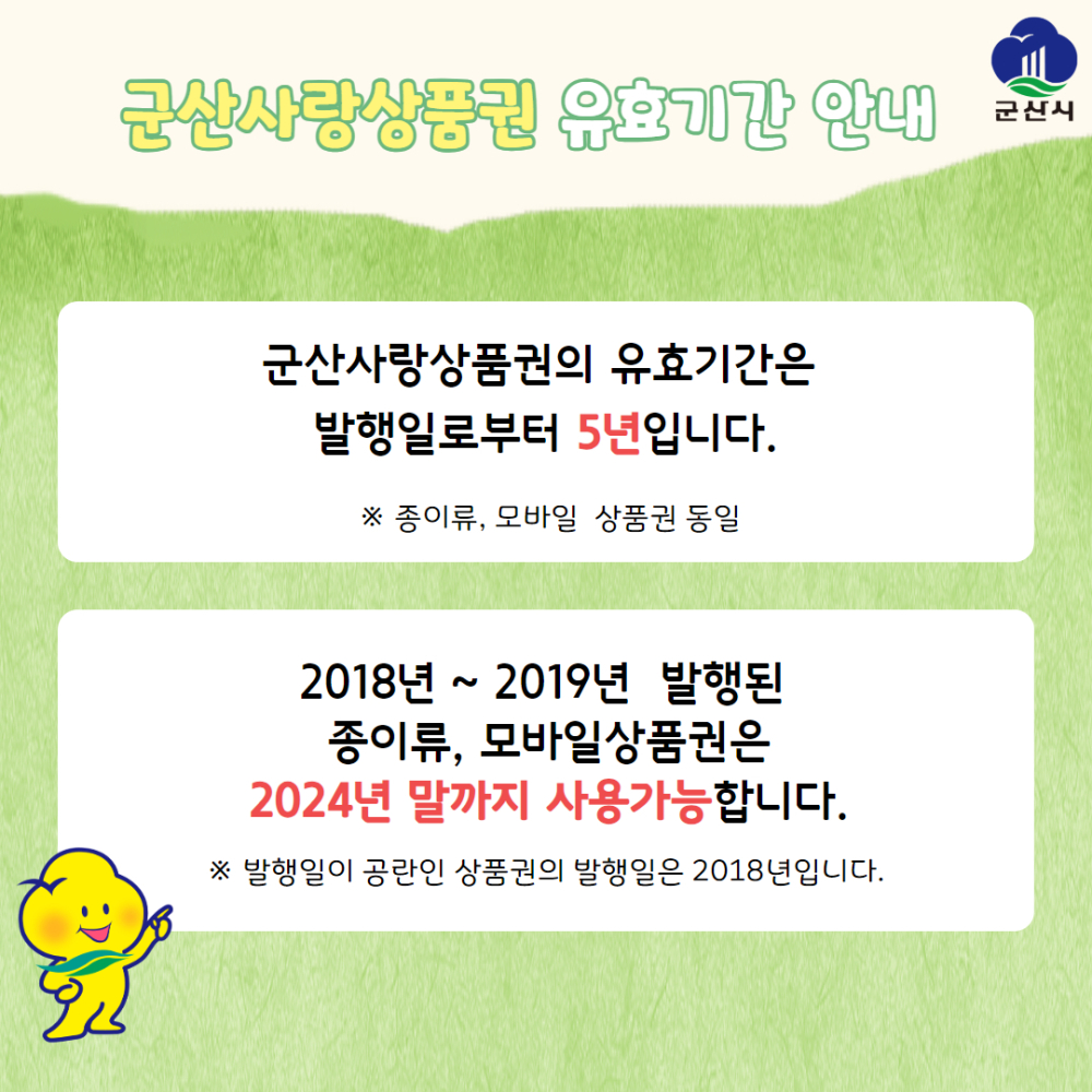 군산사랑상품권 유효기간 안내 카드뉴스를 붙임과 같이 게시합니다.