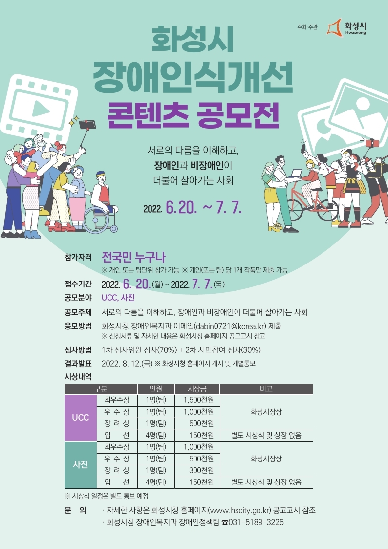 화성시에서 ‘서로의 다름을 이해하고 장애인과 비장애인이 더불어 살아갈 수 있는 행복한 사회’라는 주제로 장애인식개선 콘텐츠 공모전을 개최하오니, 많은 분들의 참여 바랍니다.
