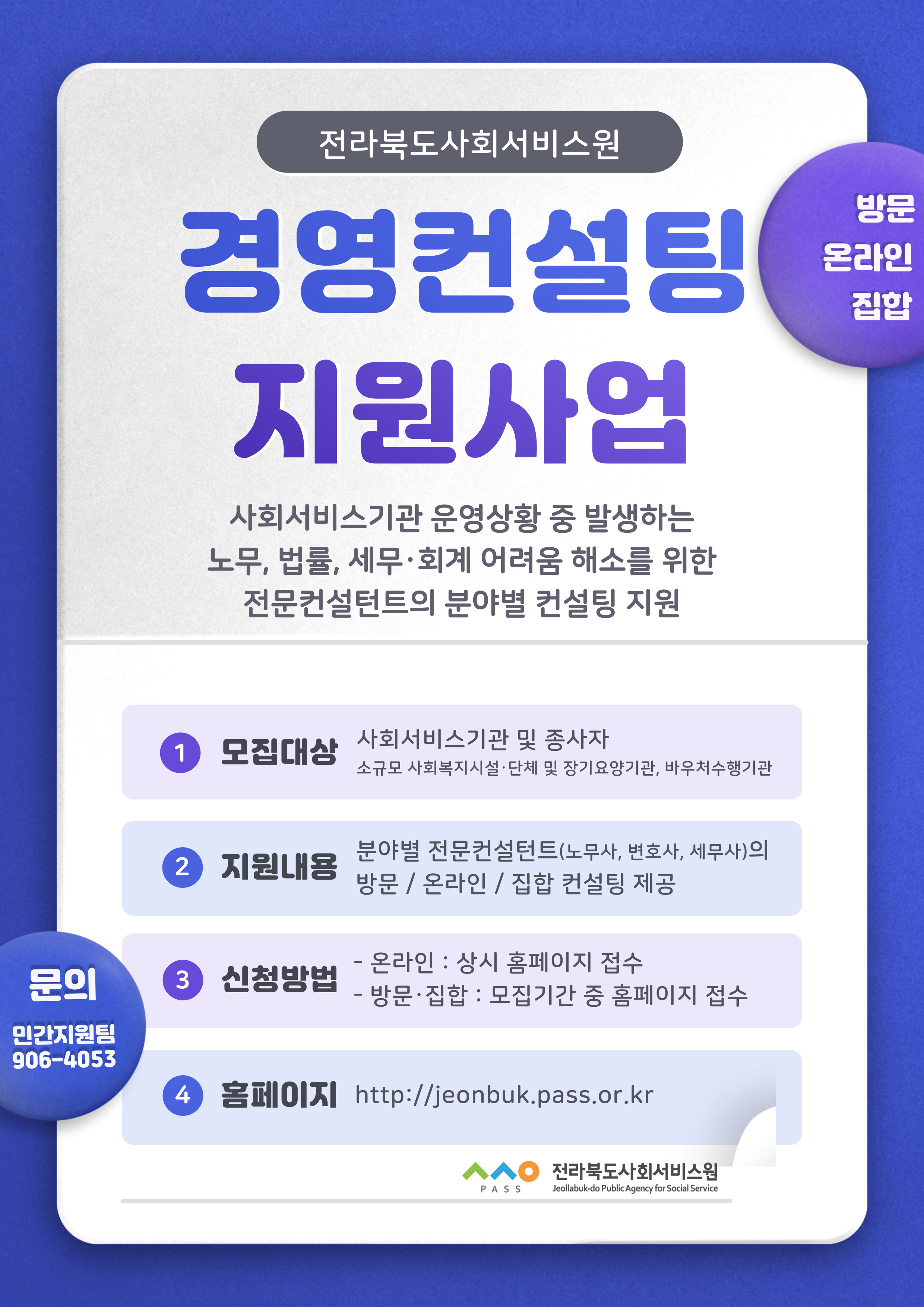 1. 전북사회서비스원에서는 사회서비스의 공공성, 전문성 및 투명성 강화로 사회서비스 품질향상에 기여하고자 사회복지시설 등 사회서비스기관 운영상황 중 발생하는 노무, 법률, 세무·회계의 어려움을 해소하기 위한 『경영컨설팅지원사업』을 실시하고 있습니다.