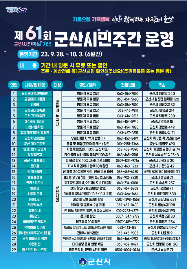 군산시민에게 무료 또는 할인혜택 제공에 많은 이용 바랍니다.