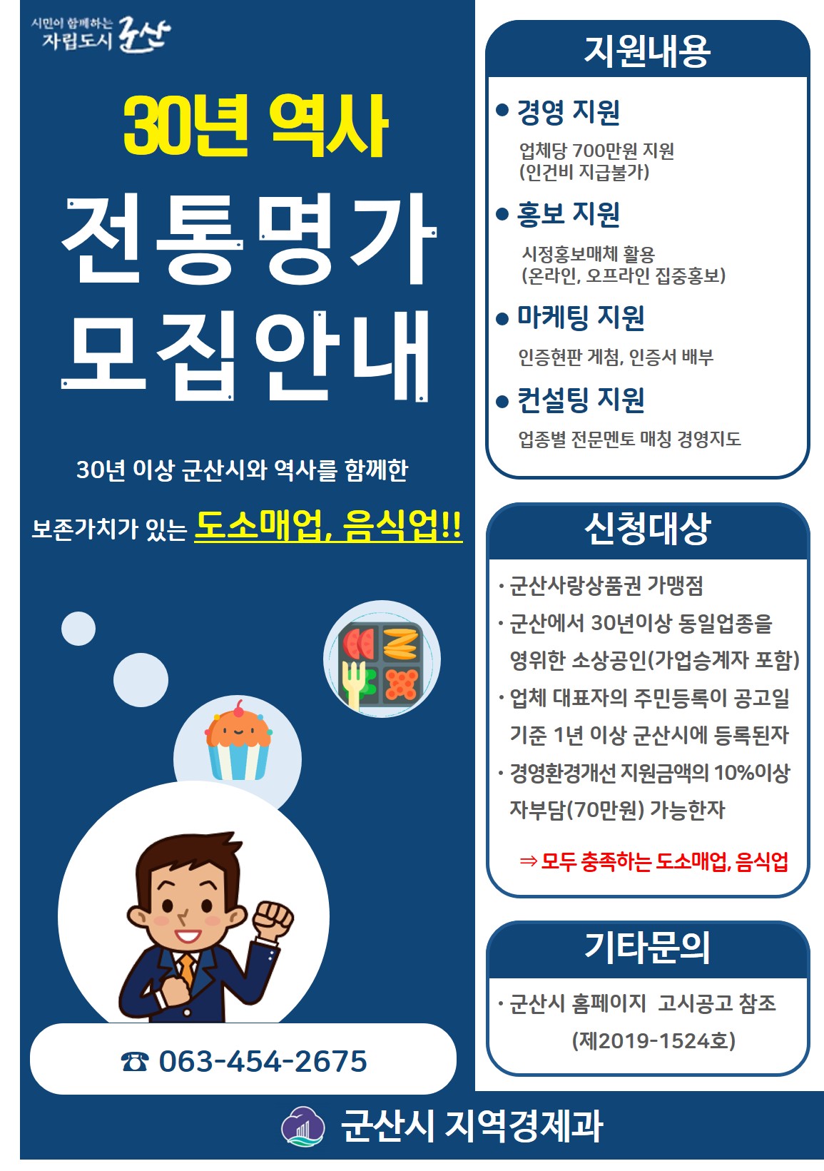 30년 이상 지역상권의 역사와 함께 한 보존가치가 있는 지역 업체를 발굴하여 경영지원 등을 통해 지속 가능성을 높일 수 있는 환경을 조성하고자 「2019년 군산 전통명가」모집