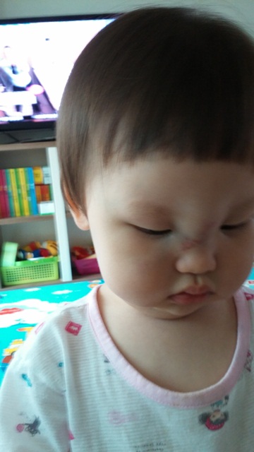 1. 7월 4일 금요일 오후 4시경 군산 영동 물빛거리에 있는 바이크리페어샵이라는 곳 앞에서, 16개월된 딸이 길 가운데에 있는 수로에 발이 걸려 물두멍이 있는 반대편으로 꼬꾸라져서 코쪽에 심한 부상을 입었습니다.