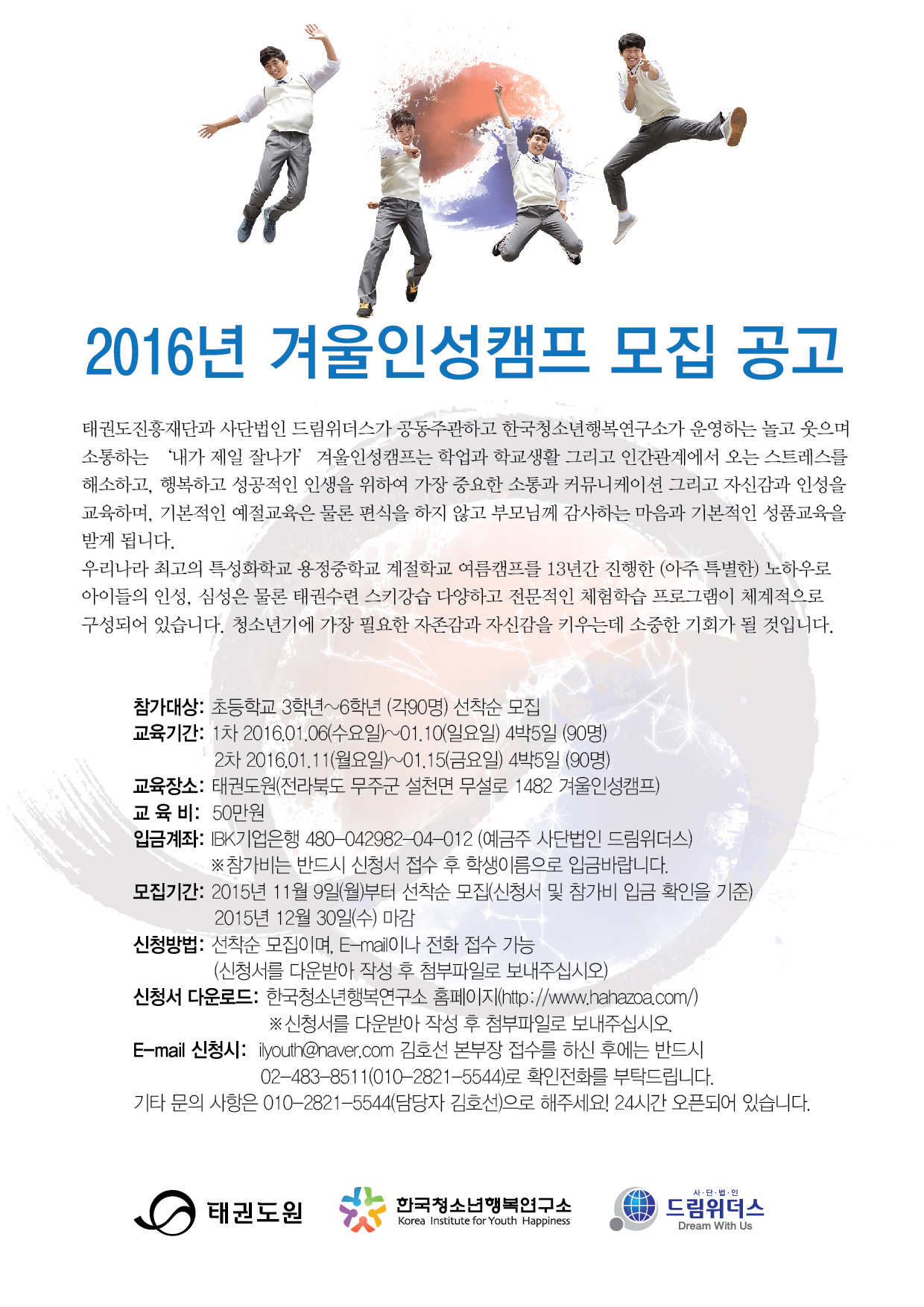 모집기간 : 2015년 11월 9일(월)부터 선착순 모집(신청서 및 참가비 입금 확인을 기준)