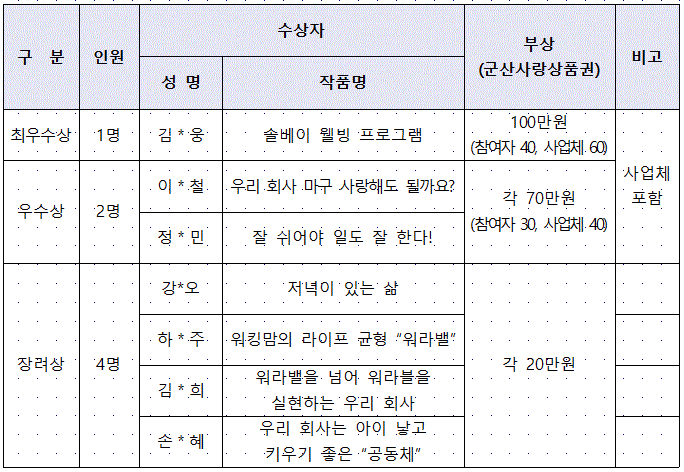 | 5913 | 아이 낳고 기르기 좋은 우리 회사 워라밸 자랑하기 공모전 수상작 안내 |