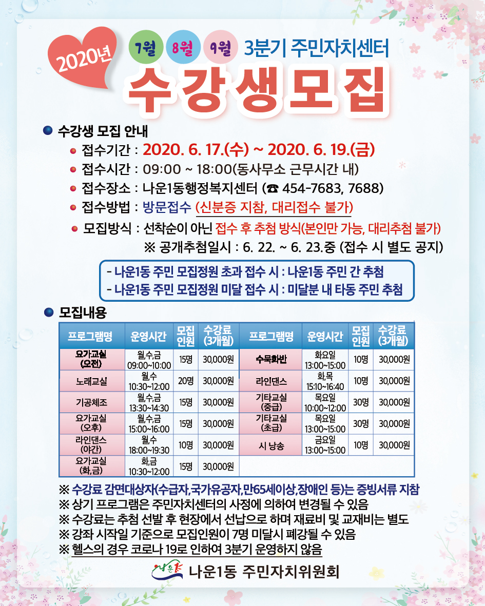 | 57 | 2020년 3분기 주민자치센터 프로그램 수강생 접수 안내 |