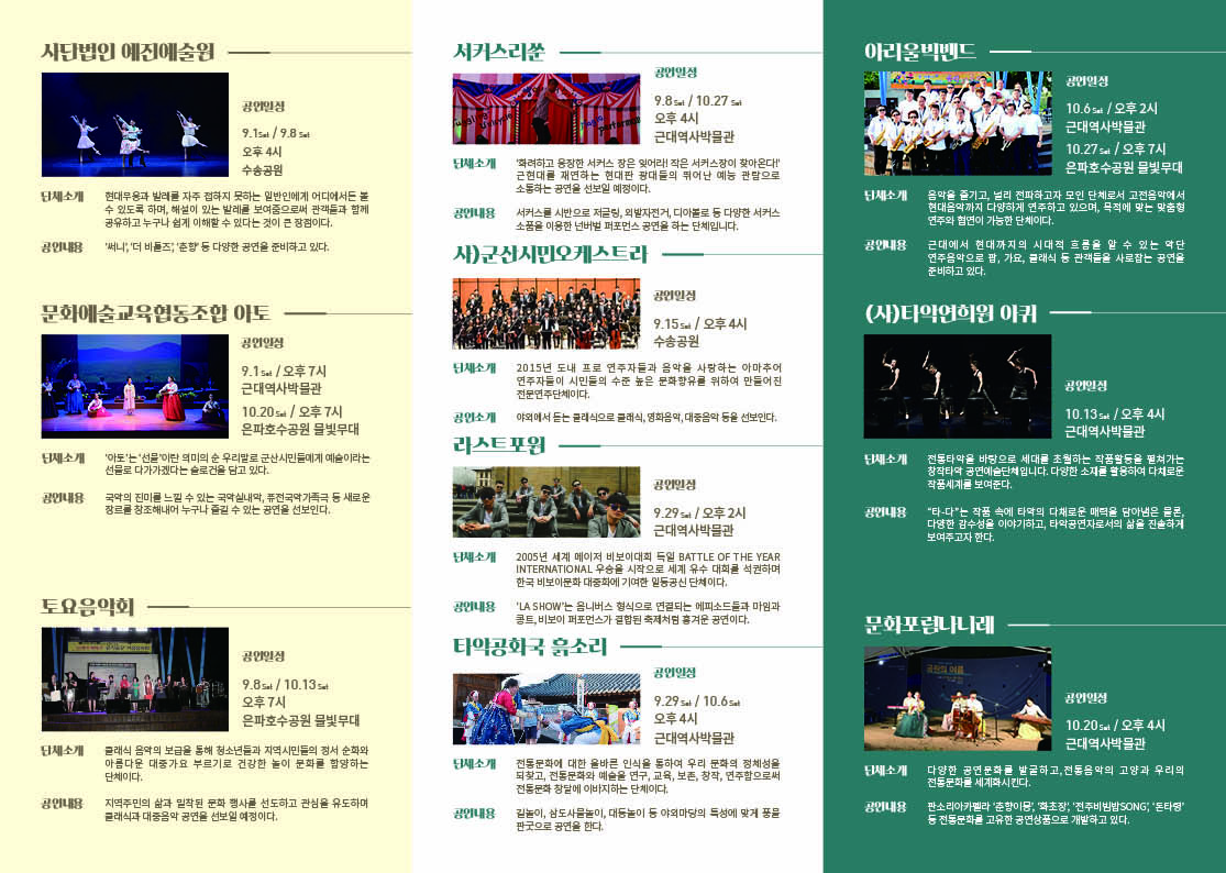 타악, 클래식, 연극, 창극 등 다양한 장르의 공연을 진행하고 있습니다.
