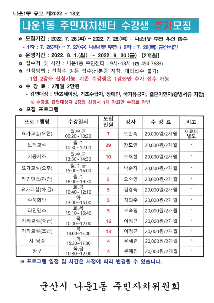 | 9 | 2022년 3분기 나운1동 주민자치 프로그램 수강생 모집 |