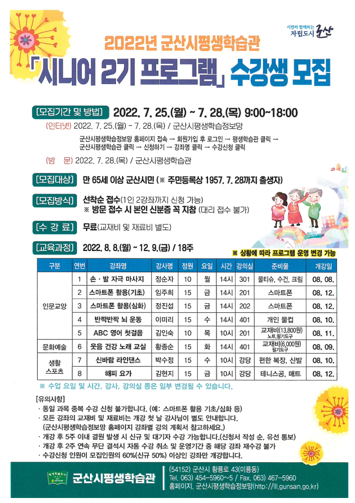 | 11 | 군산시평생학습관 시니어2기 프로그램 수강생 모집 |
