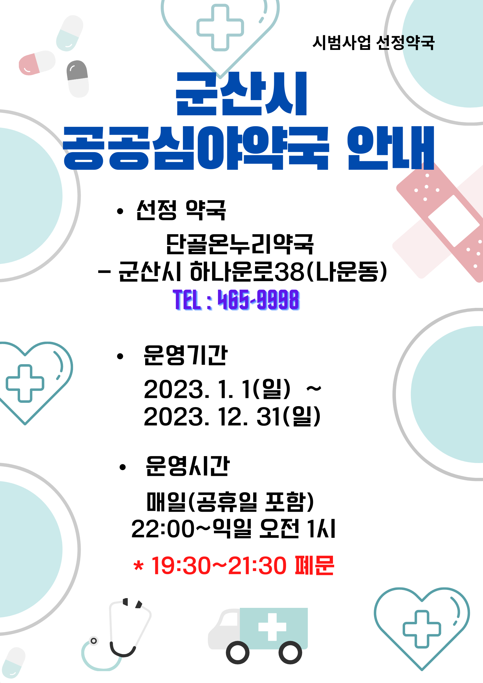 군산시 공공심야약국 시범사업 선정약국 운영 안내입니다.