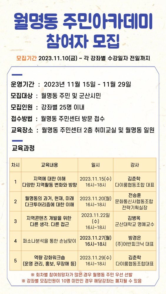 | 289 | "2023년 월명동 주민아카데미 참여자 모집" |
