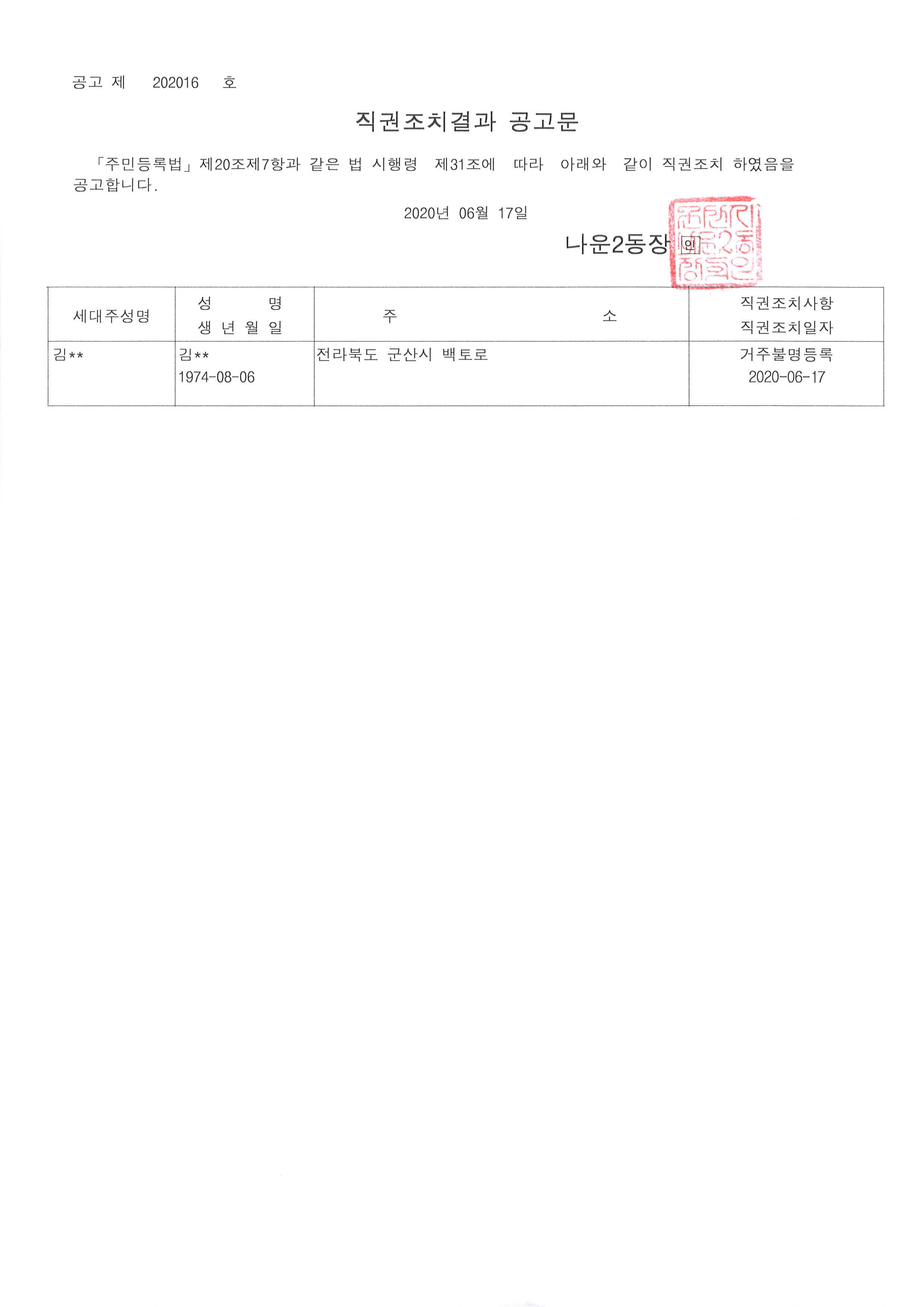 | 62 | 주민등록 거주사실 불일치자 최고공고 |