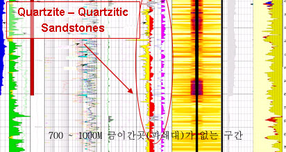 산자부에서는 저 금이간곳(파쇄대) 부분만을 확인하여 DST구간이라고 설정하기에는 어렵다라고 발표했지만 사실은 그렇지 않습니다. 총 파쇄대 구간(붉은 박스)이 4개로 되어있지만 그림을 보시면 금이 간곳은 4군대 외에 여러군대 더 있다는 것을 확인하실수 있지요, 이는 금이 크게 나질 않아 일딴 핼리버튼에서 유징구간으로 선택하지 않은 것입니다.