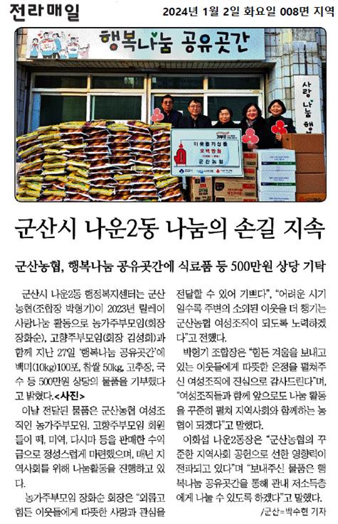 | 212 | 군산농협, 행복나눔 공유곳간에 식료품 등 500만원 상당 기탁 |