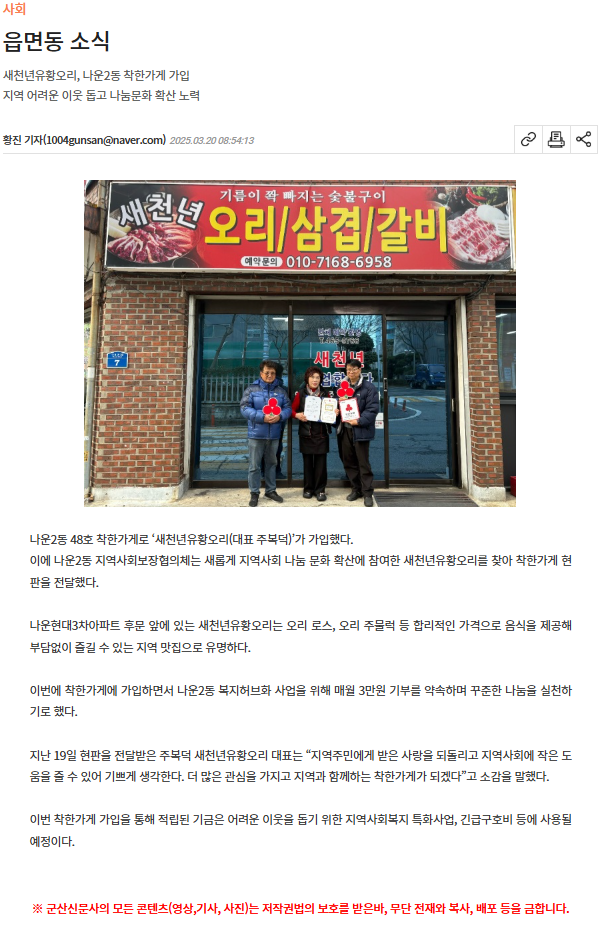 | 347 | 새천년유황오리 착한가게 현판 전달 |