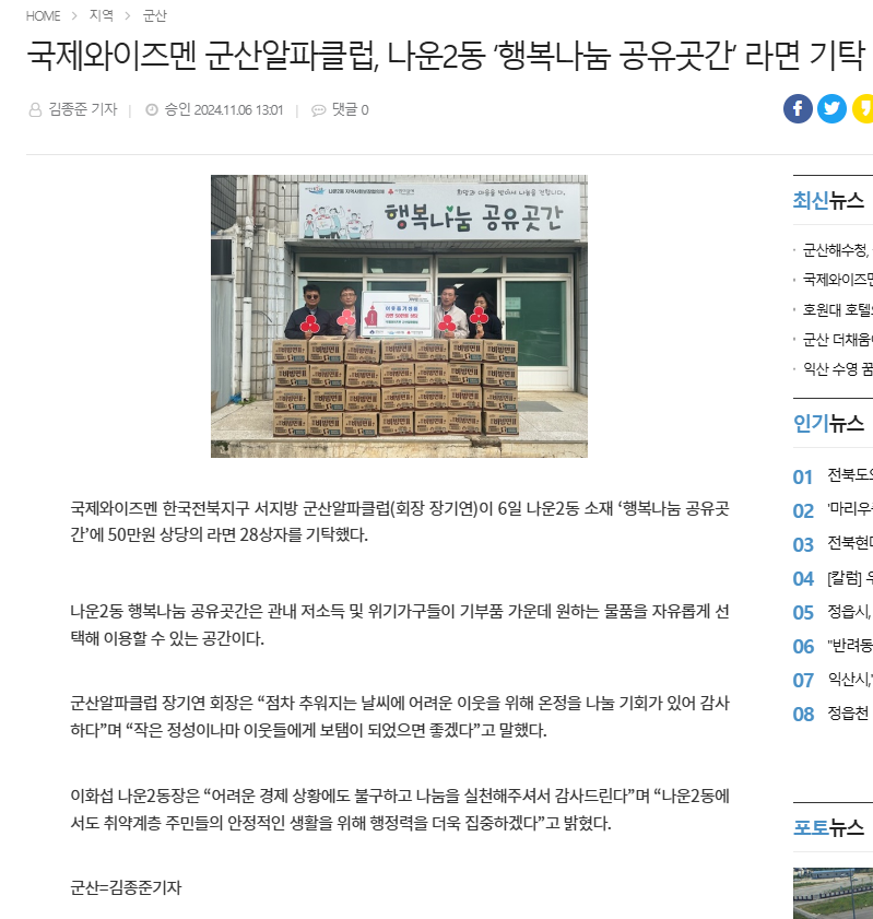 | 339 | 국제와이즈멘 군산알파클럽, 나운2동 '행복나눔 공유곳간' 라면 기탁 |