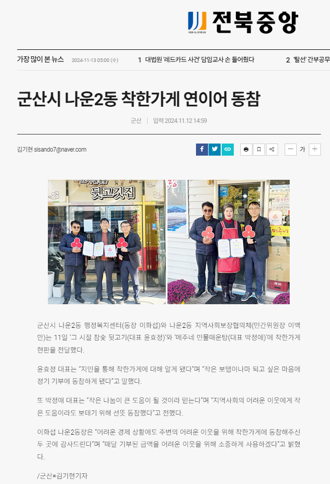 | 340 | 군산시 나운2동 착한가게 연이어 동참 |