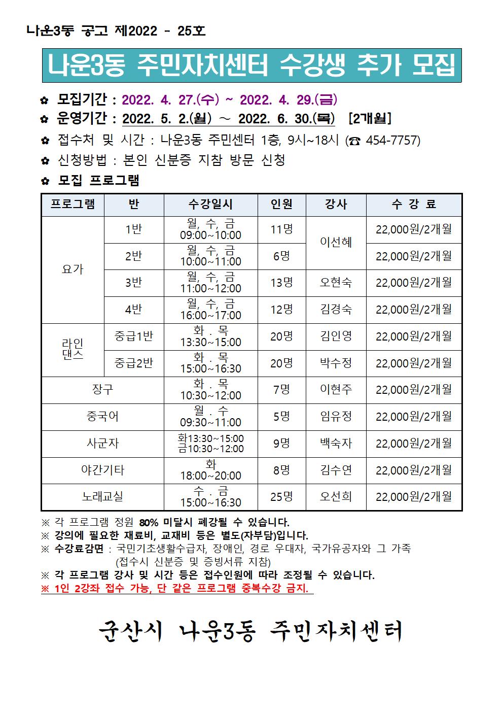 | 494 | 2022년 2분기 주민자치 프로그램 수강생 추가모집 공고문 |