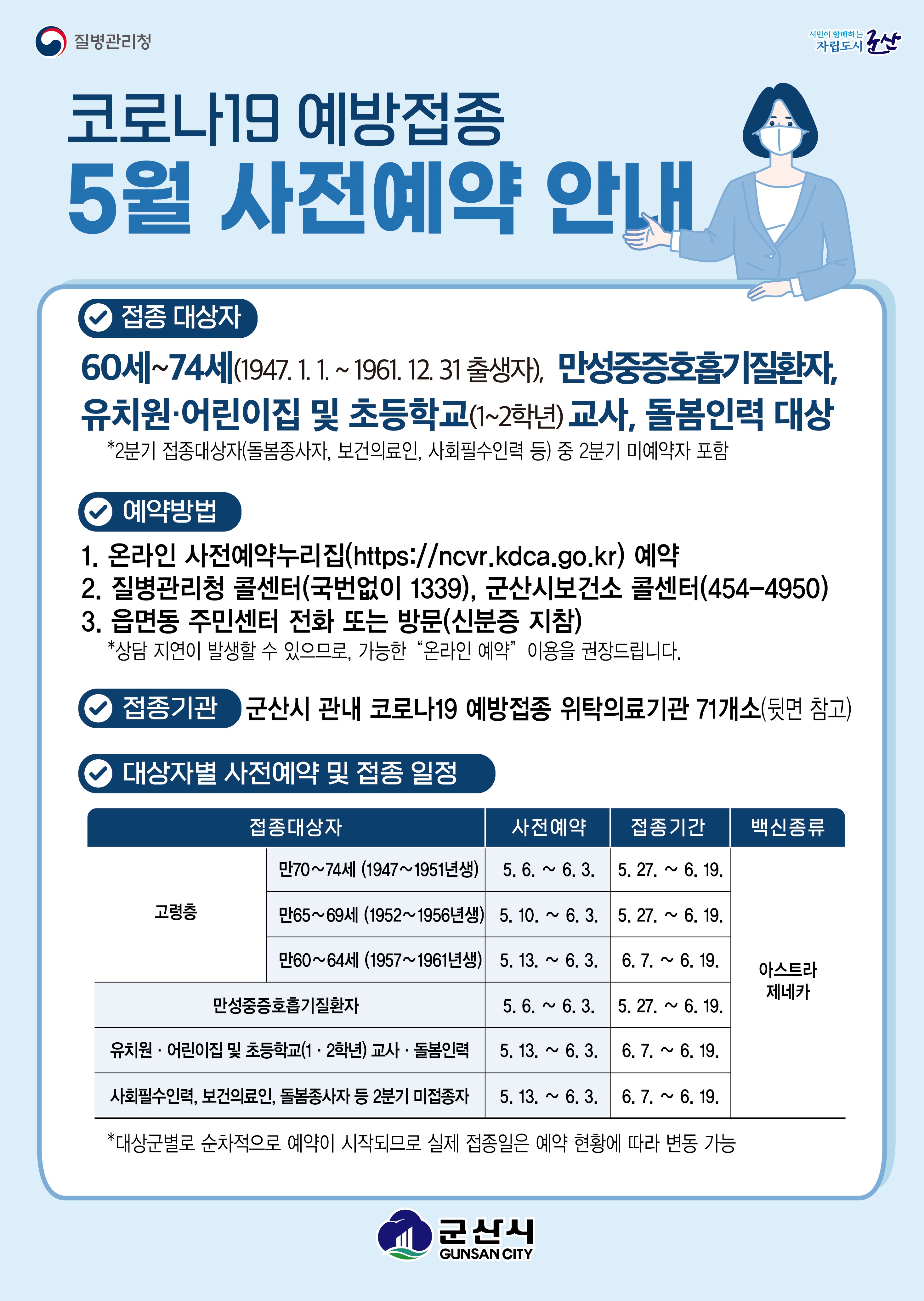 - (전화예약) 중앙(☏국번없이 1339), 보건복지부 복지상담센터(☏국번없이 129), 군산시보건소(☏063-454-4950)