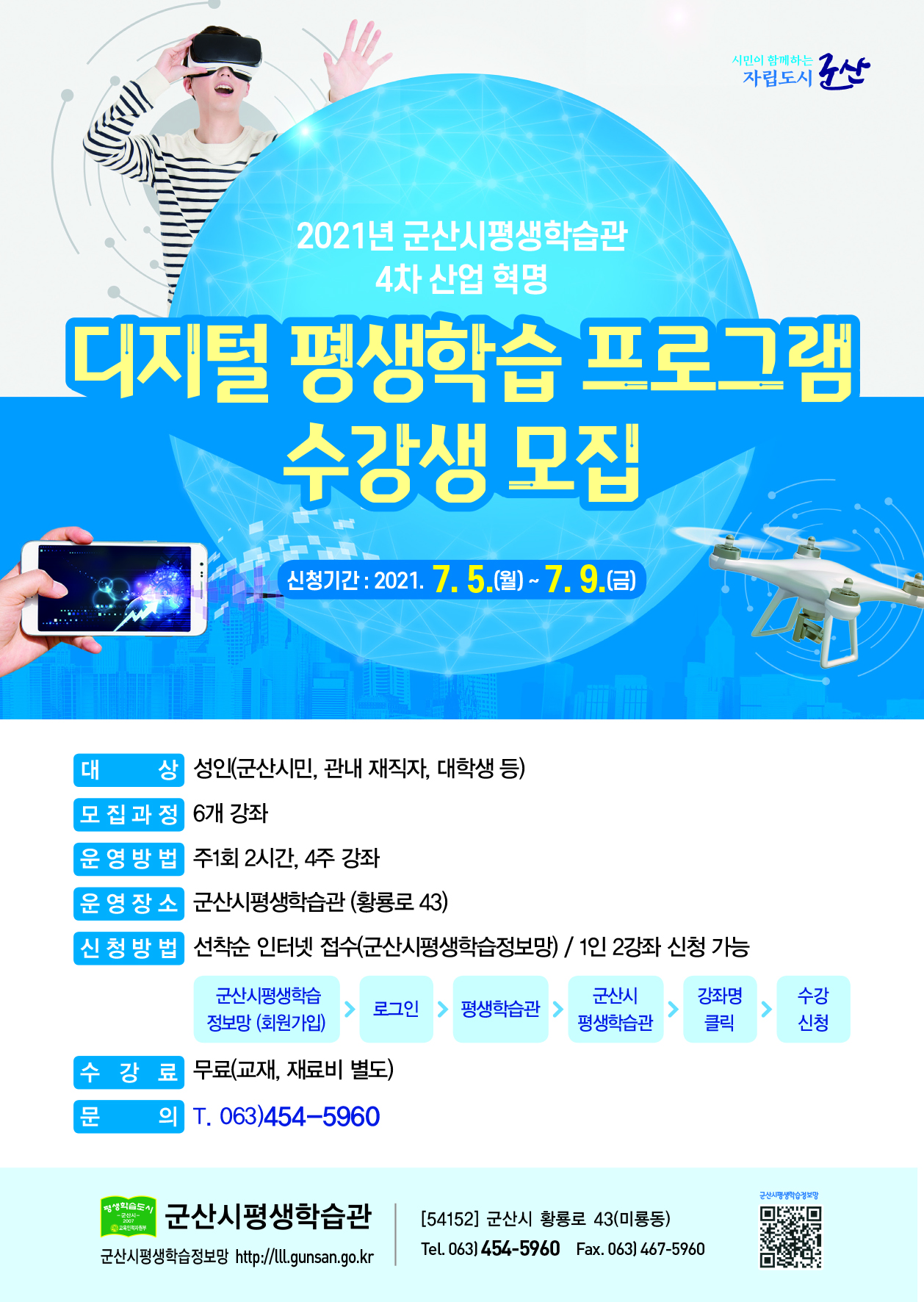 군산시평생학습관에서는 현대사회 급변화에 따라 시민들이 4차 산업혁명에 대한 이해와 관심을 높이기 위해 디지털 평생학습 프로그램 수강생을 다음과 같이 모집하오니 관심있는 시민들에게 홍보하여 주시기 바랍니다.