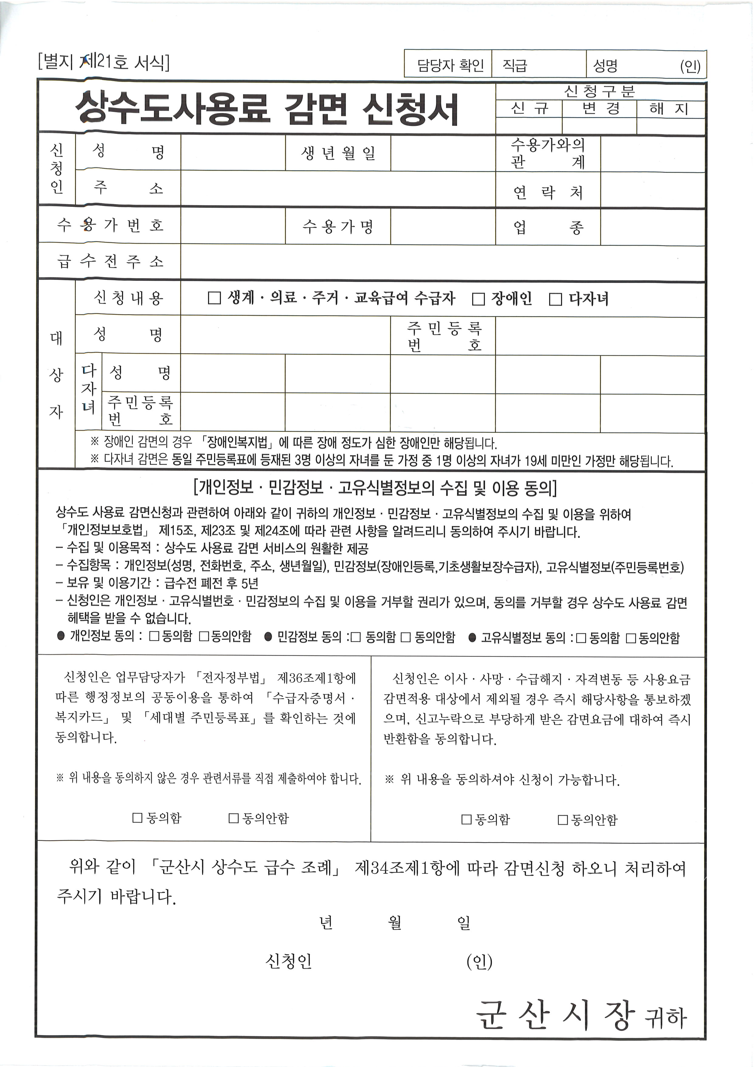 상수도사용료감면신청서.jpg (파일크기: 765 kb, 다운로드 : 284회) 미리보기
