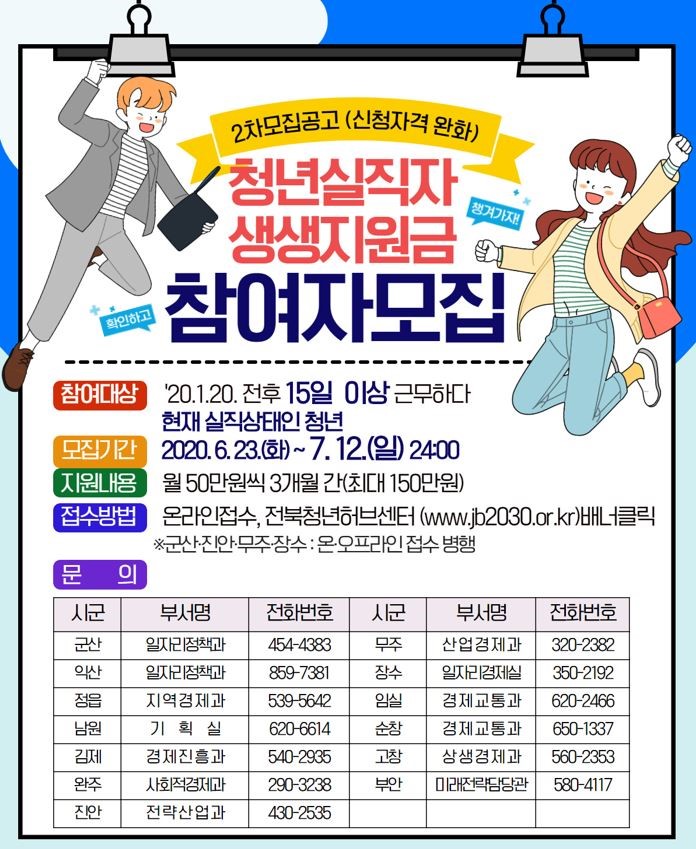 우리시는 단기근로, 아르바이트 등을 종사하다 코로나19확산으로 실직한 청년을 지원하는 「청년실직자 생생지원금 지원사업」 지원대상자를 다음과 같이 모집하고 있으니 많은 홍보 바랍니다 .