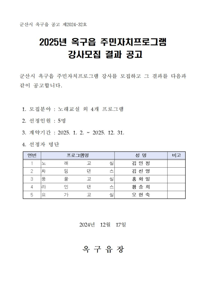 | 70 | 2025년 옥구읍 주민자치프로그램 강사모집 결과 공고 |