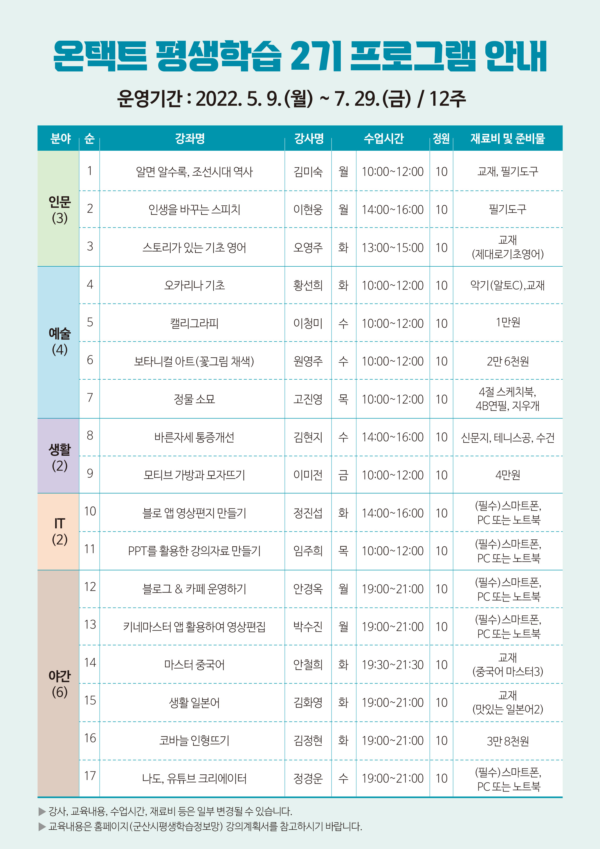 □ 신청자격 : 군산시민, 관내 재직자, 대학생 등(1인 2강좌 신청가능)