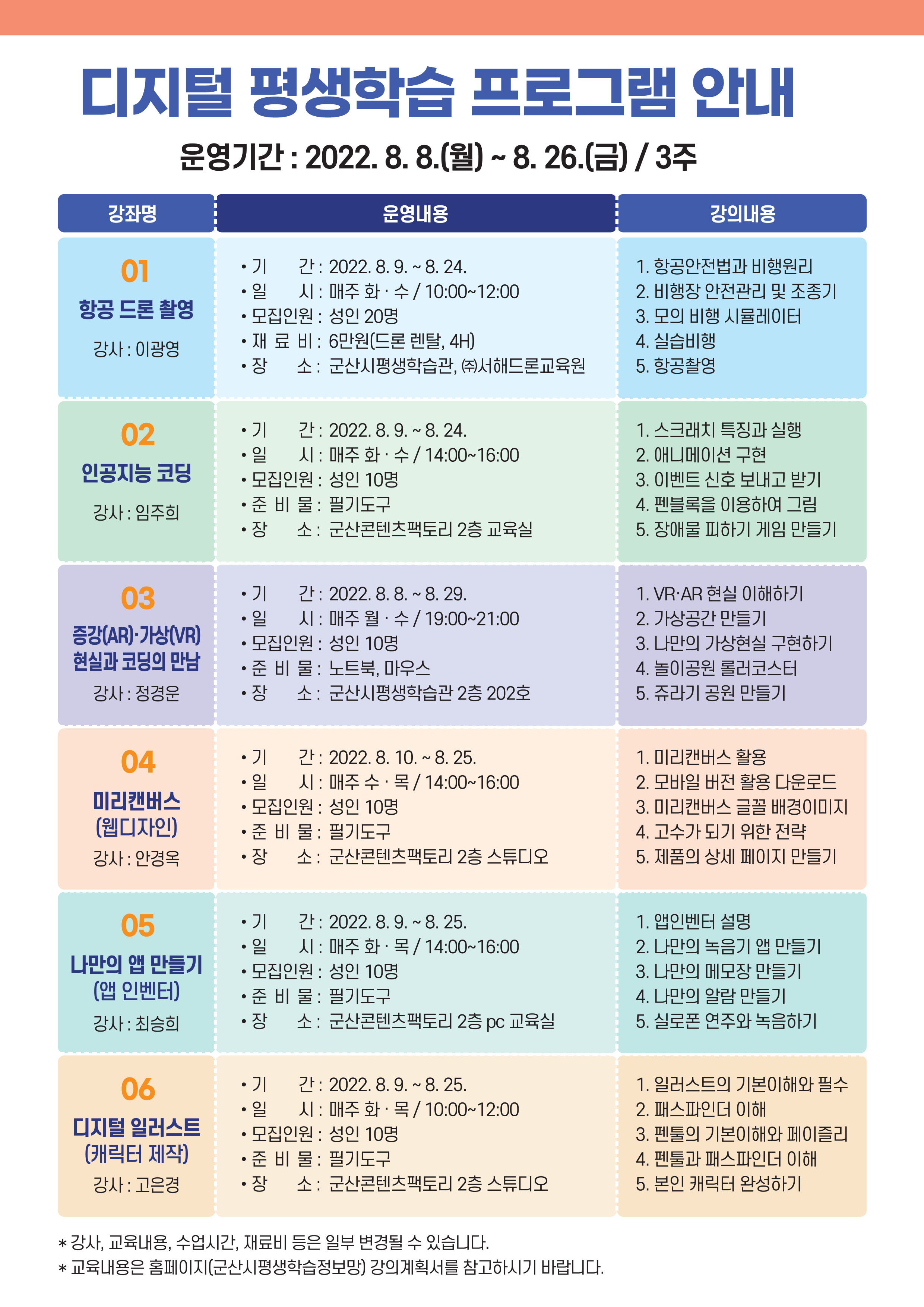 □ 모집과정 : 6개 강좌 (드론, 코딩, 중강 가상현실, 미리캔버스, 나만의 앱만들기, 디지털 일러스트)