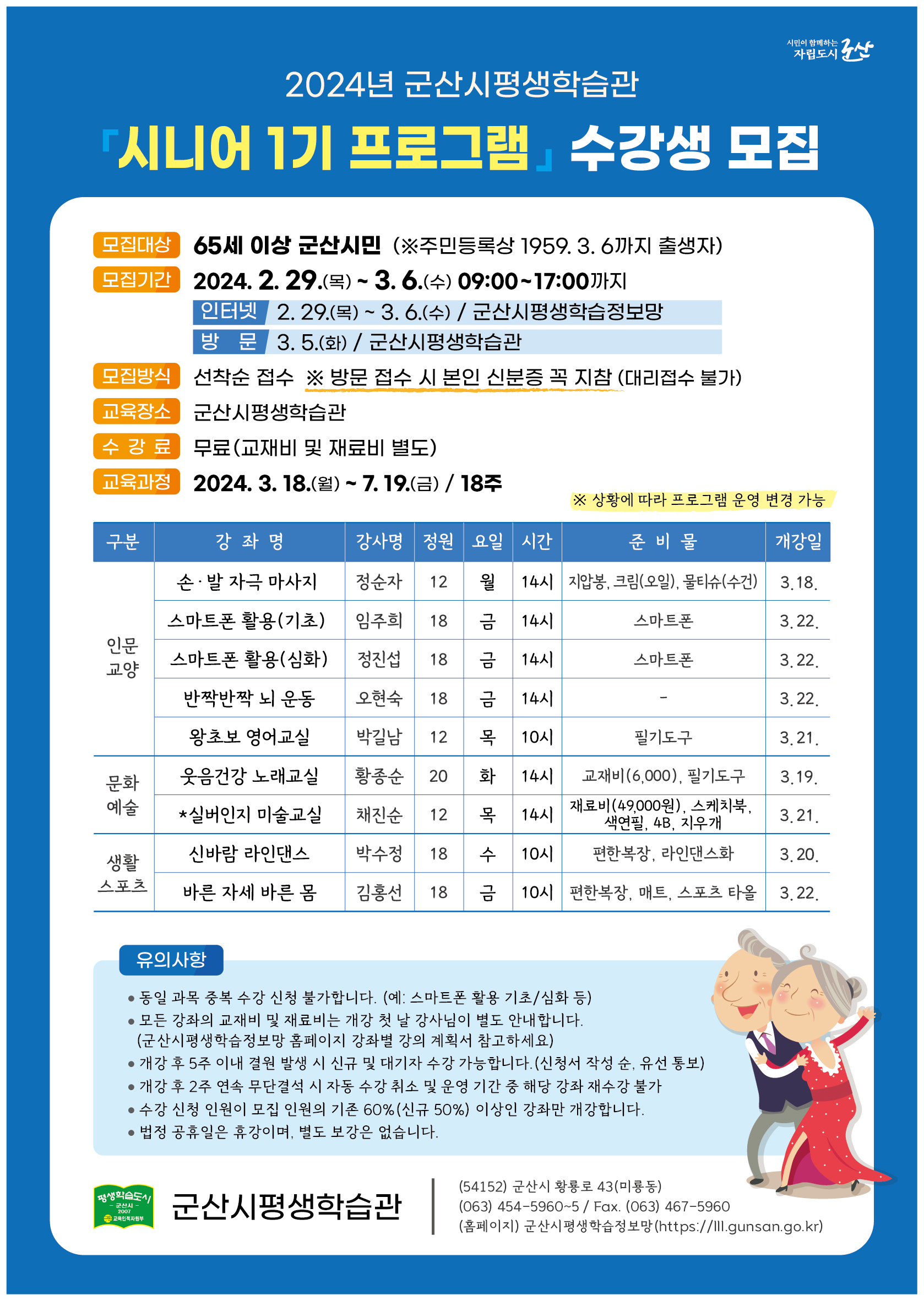 "2024 군산시 평생학습관 시니어 1기 프로그램" 수강생을 다음과 같이 모집하오니,