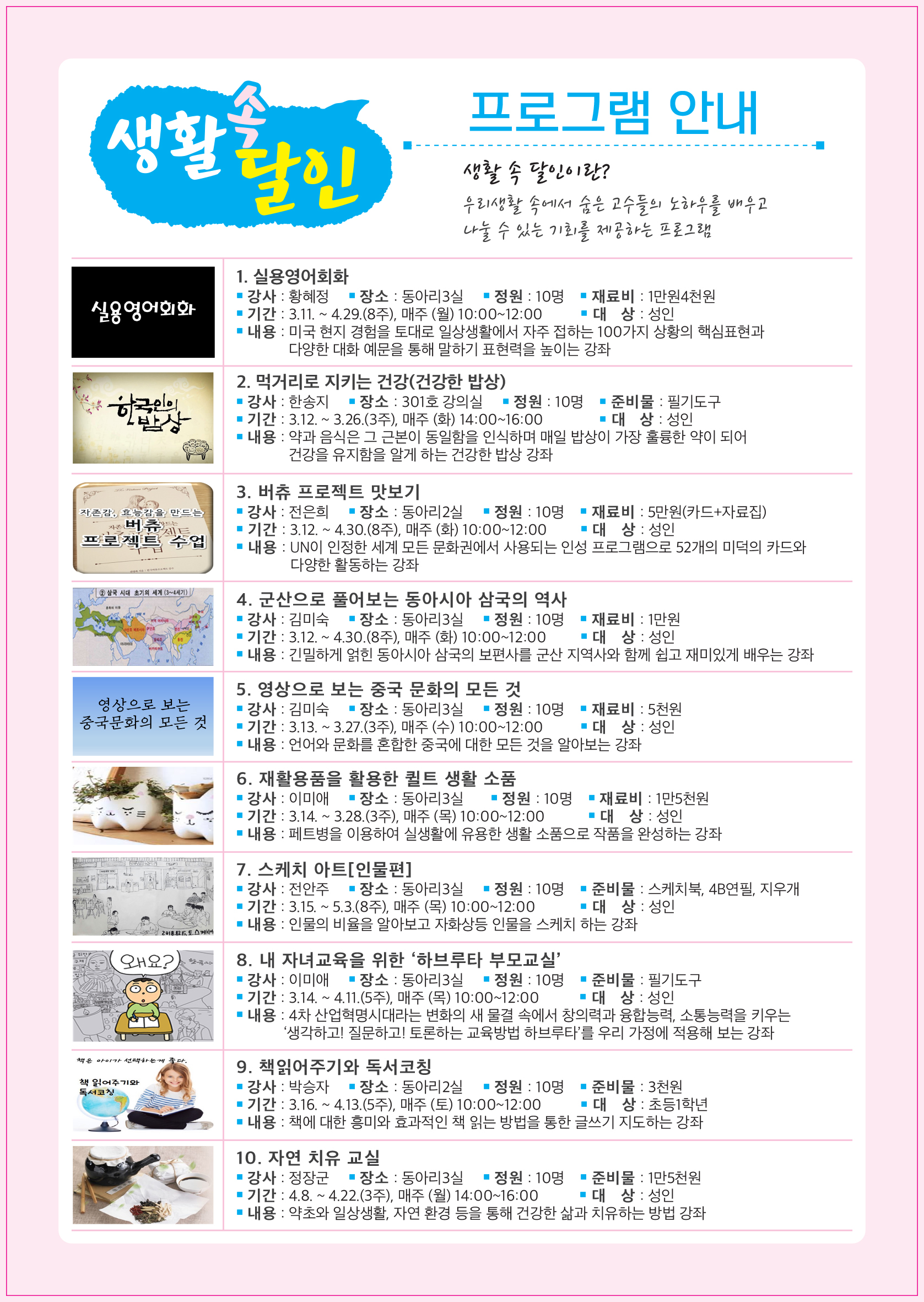 ▶ 모집내용 : "먹거리로 지키는 건강" 등 10개 강좌