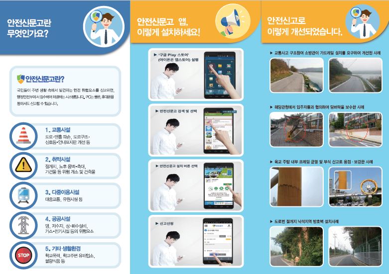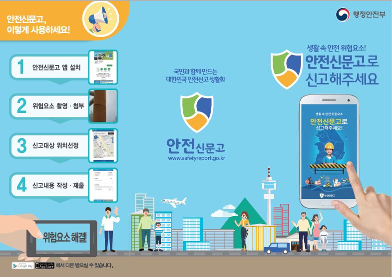 정부에서는 국민들의 생활 속 안전 유해요소를 조기 발견하여 스마트폰으로 신고함으로써 안전사고를 예방하는『안전신문고』제도를 운영중에 있습니다.