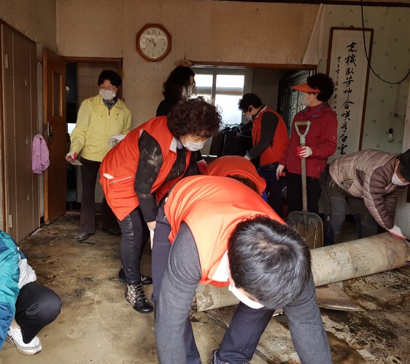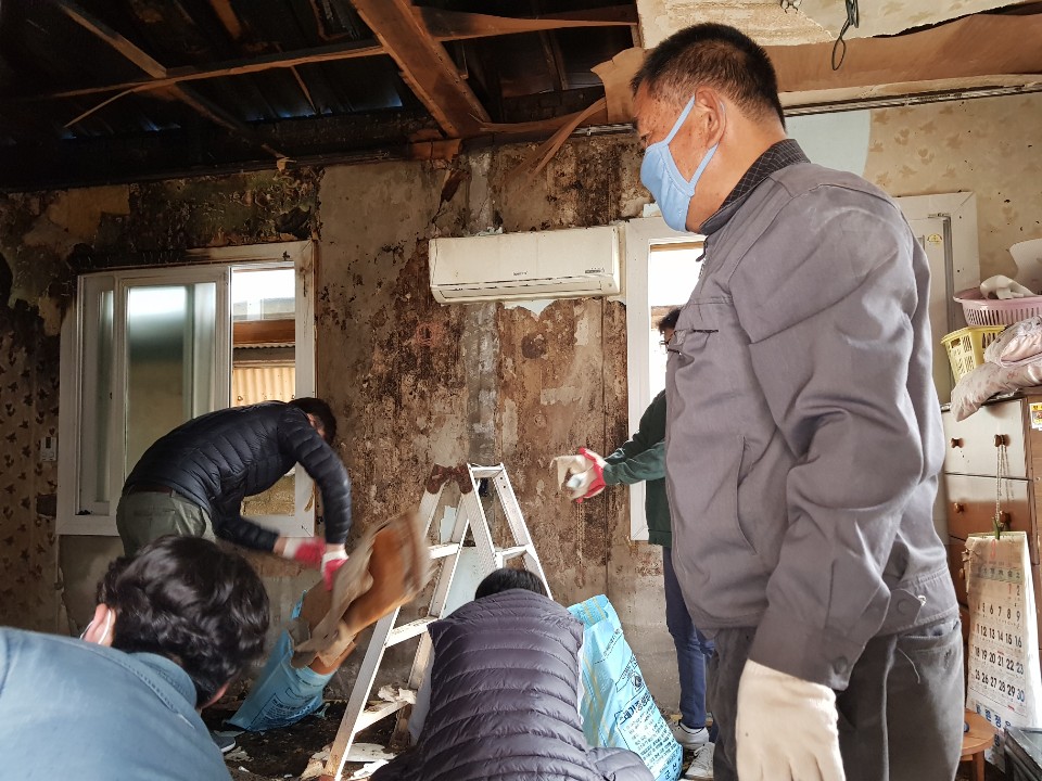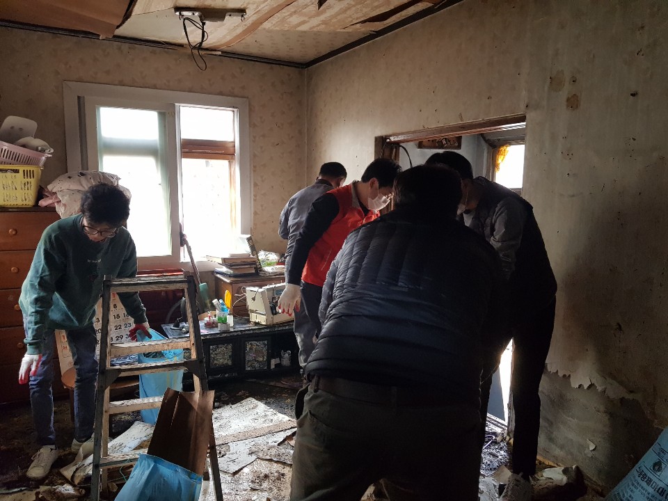홀몸어르신 댁을 찾아 그을리고 물에 젖은 세간살이를 같이 정리하며