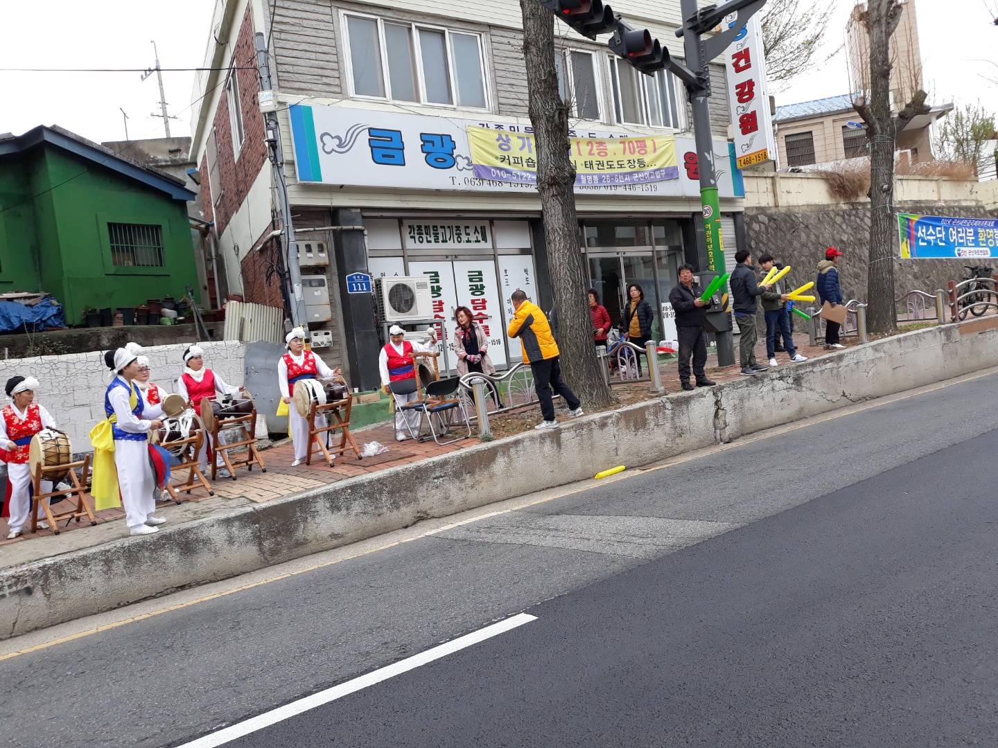 주민센터풍물단이 합심하여 우리지역을 통과하는 마라톤 선수들에게 힘과 용기를 주는