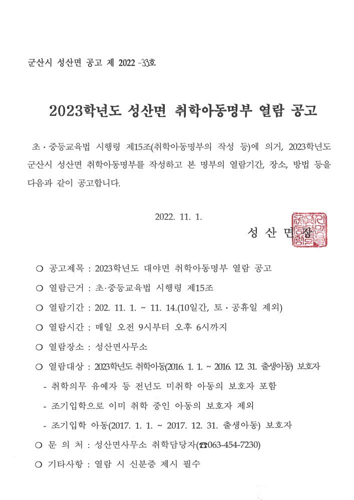 | 35 | 2023학년도 성산면 취학아동명부 열람 공고 |