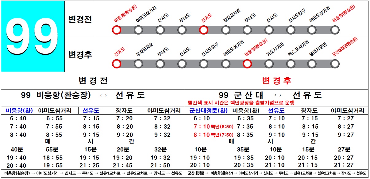우리시에서는 선유도~비응항 2층버스 이용자 편의 증진 및 이용활성화를 위해 97번, 99번(2층버스) 노선 변경사항을 다음과 같이 알려드립니다.