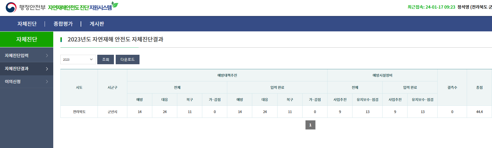 「자연재해대책법」제75조의 2에 따라 실시한 "2023년 자연재해 안전도 진단 결과"를 「재난 및 안전관리 기본법」 제33조의 3에 따라