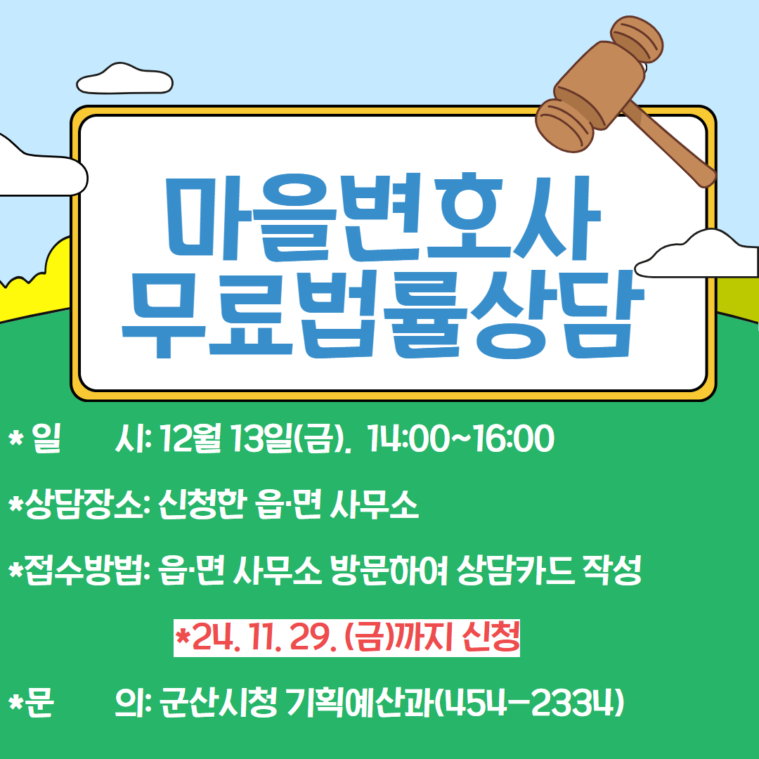 법률 사각지대에 있는 무변촌 지역 주민들의 법률복지 향상을 위하여 2024년도 3분기 마을변호사 무료법률상담을 시행하니, 많은 신청 부탁드립니다.