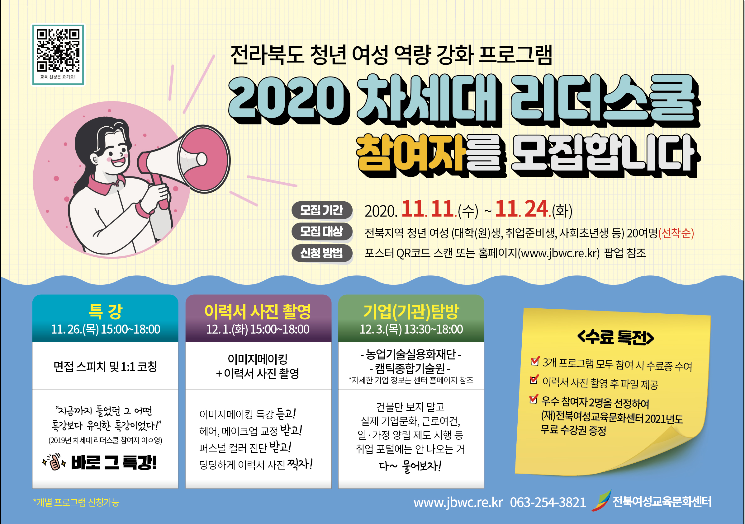 1. (재)전북여성교육문화센터는 전라북도 출연기관으로 진로에서 경력으로 이동하는 시기의 전북지역 청년 여성들에게 실질적으로 필요한 취업 역량 강화 프로그램을 제공하여 지역을 이끌어갈 차세대 여성 인재를 양성하고자 「2020 차세대 리더스쿨」 사업을 추진하고 있습니다.