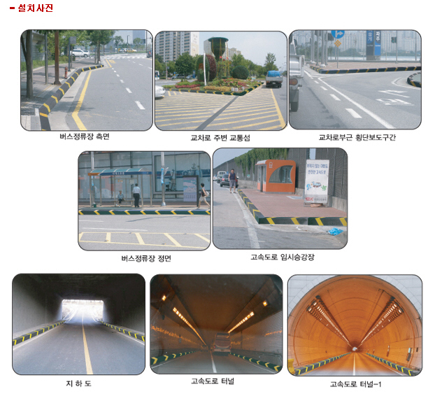 보호대에 부착된 반사지는 광각반사지를 선택, 일반 반사지보다 시인성이 뛰어나 터널 내부의 보차도 경계 블럭, 커브구간의 보차도 경계 블럭, 교차로의 교통섬 보차도 경계 블럭, 화단형 중앙 분리대 단면부 경계 블럭 등 시인성이 떨어져 큰 사고로 이어지는 곳의 사고를 예방하기 위한 목적으로 설치되고 있습니다.