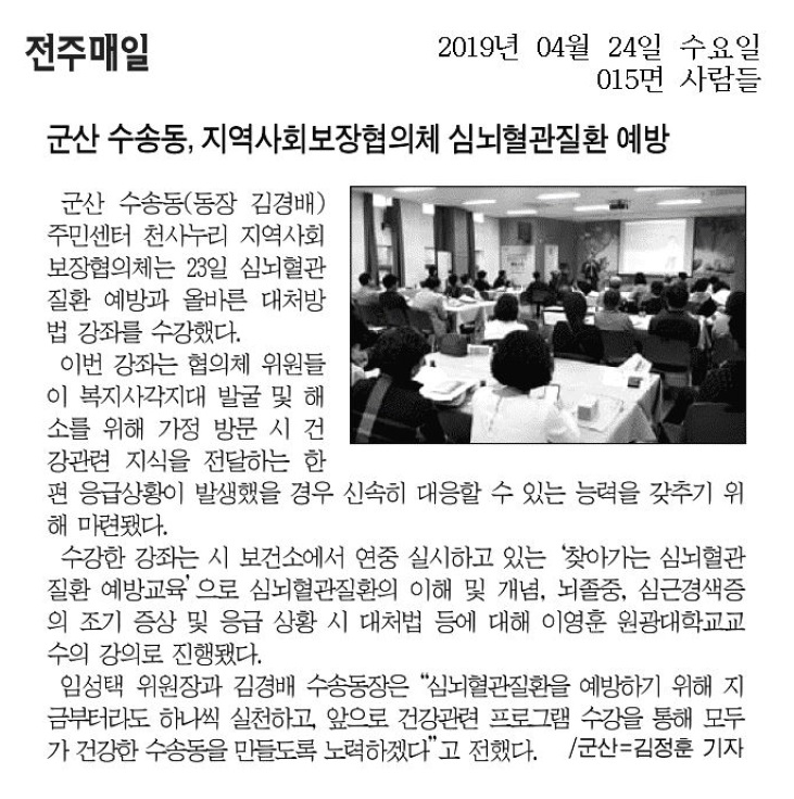 지난 23, 군산시 수송동 천사누리 지역사회보장협의체(공동위원장 김경배, 임성택) , “심뇌혈관질환 예방과 올바른 대처방법강좌를 수강하였다.
