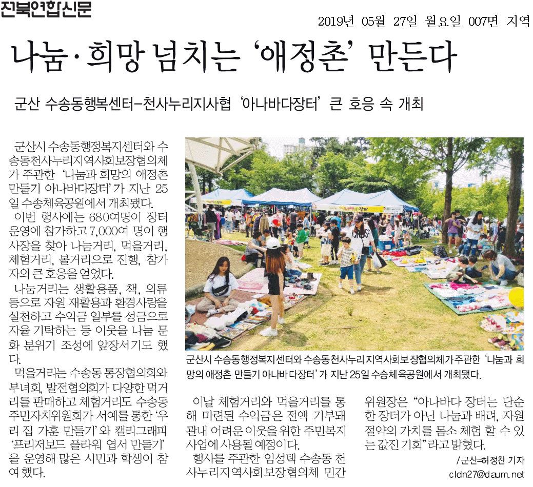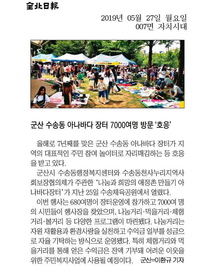한편, 수송동 아나바다 장터는 2013년 처음 시작하여 올해로 7년째를맞이하고 있으며 자원과 환경을 생각하고 이웃이 이웃을 돕는 가치를 공유하는 군산의 대표적인 주민 참여 놀이터로 자리매김 하고 있다.