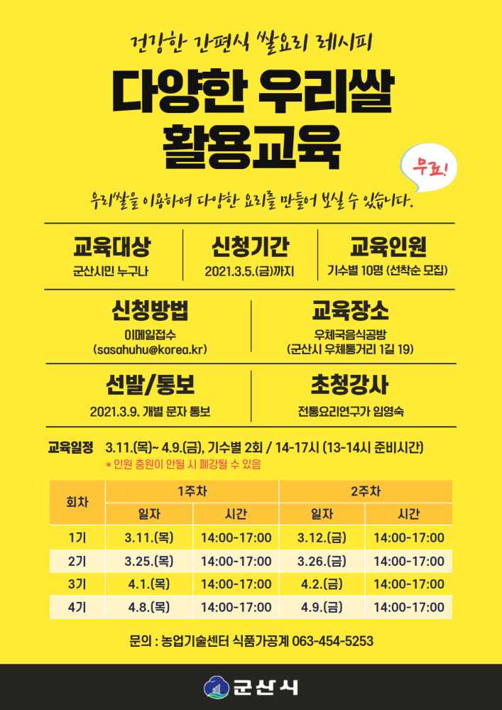 | 103 | 2021년 다양한 우리쌀 활용교육 신청자 모집(접수마감) |