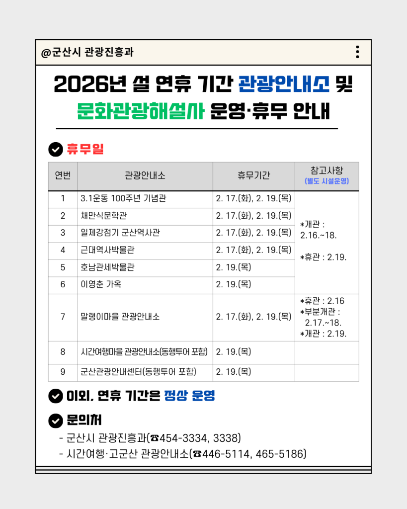 | 306 | 2026년 설 연휴 기간 관광안내소 및 문화관광해설사 운영·휴무 안내 |