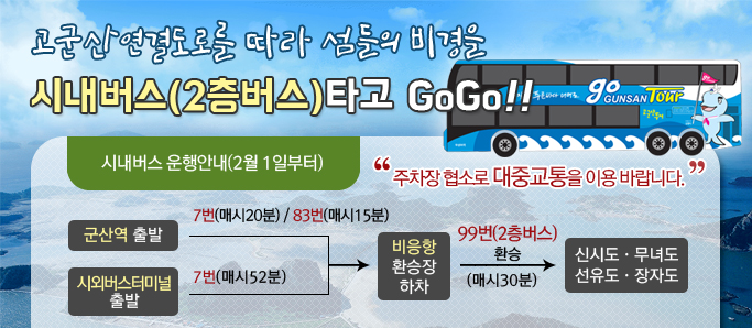 고군산군도를 찾는 관광객 및 시민들에게 대중교통 서비스 제공을 목적으로 관광형 2층 시내버스가 도입·운영 됩니다.