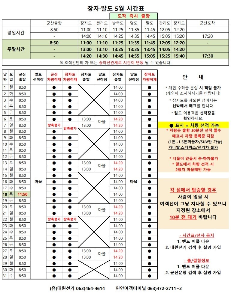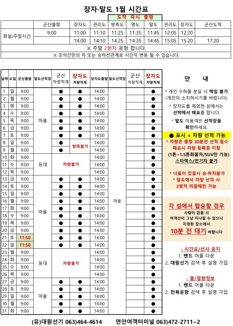 여객선 안내 -군산 연안여객터미널 (유) 대원종합선기 1644-8774 (임해로 378-8)(어청도 개야도 연도)
