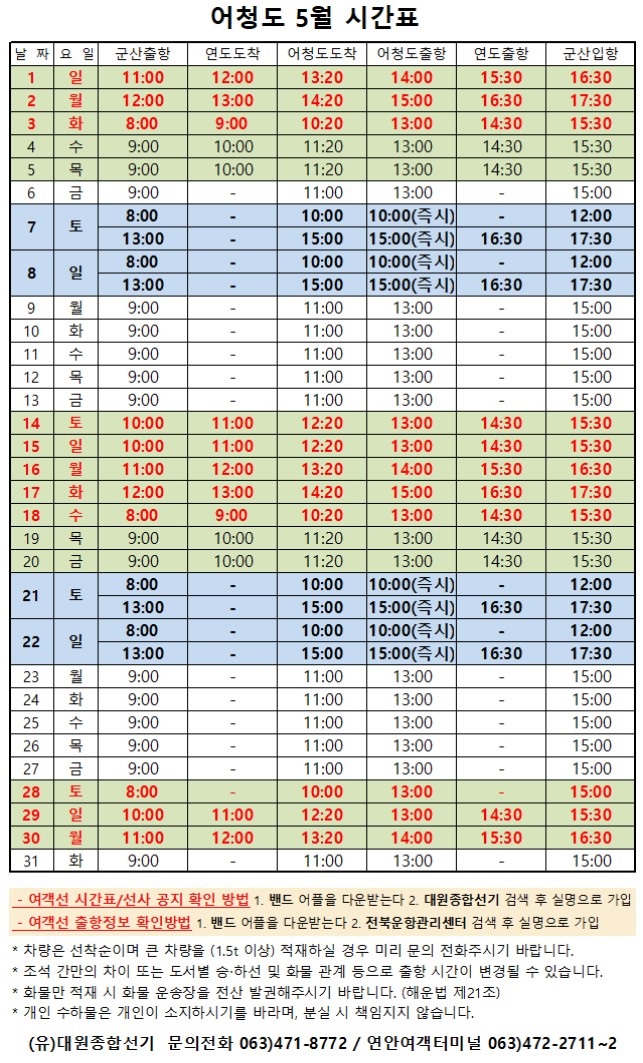여객선 안내 -군산 연안여객터미널 (유) 대원종합선기 1644-8774 (임해로 378-8)(어청도 개야도 연도)