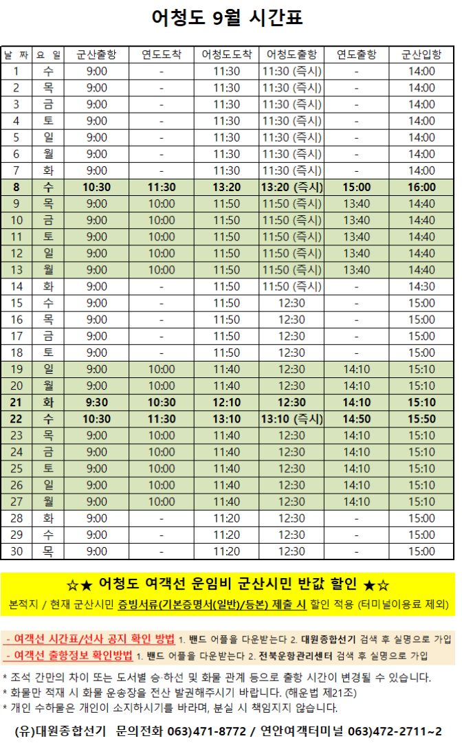 여객선 안내 -군산 연안여객터미널 (유) 대원종합선기 1644-8774 (임해로 378-8)(어청도 개야도 연도)