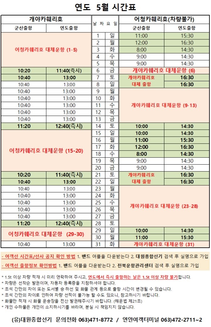 여객선 안내 -군산 연안여객터미널 (유) 대원종합선기 1644-8774 (임해로 378-8)(어청도 개야도 연도)